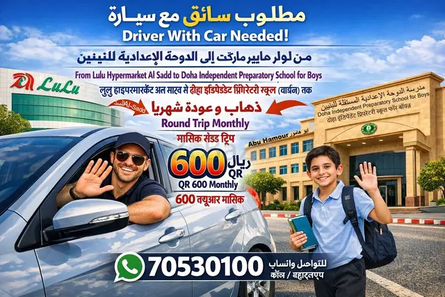 مطلوب سائق مع سيارة لتوصيل طالب من لولوهايبرماركت السد الى مدرسة الدوحة الاعدادية المستقلة للبنين ذهاب و عوده من 7 صباحا الى 1 ظهرا من الاحد الى الخميس السعر شهريا 600 ريال قطري للتواصل 71212552